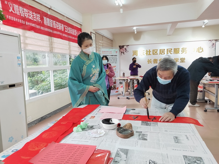 文明風(fēng)1月6日訊 臨近新春佳節(jié)之際,為營(yíng)造喜慶的社區(qū)氛圍,為特殊人群送溫暖,構(gòu)建友好社區(qū)環(huán)境,近日,共青團(tuán)福州市委員會(huì)、鼓樓區(qū)民政局、溫泉街道辦事處、溫泉街道河?xùn)|社區(qū)、溫泉街道社工站、福州市小桔燈社會(huì)工作服務(wù)中心、陽(yáng)光詩(shī)社共同舉辦“義贈(zèng)春聯(lián)送吉祥,翰墨留香迎新春”五社聯(lián)動(dòng)獻(xiàn)愛(ài)心活動(dòng)。