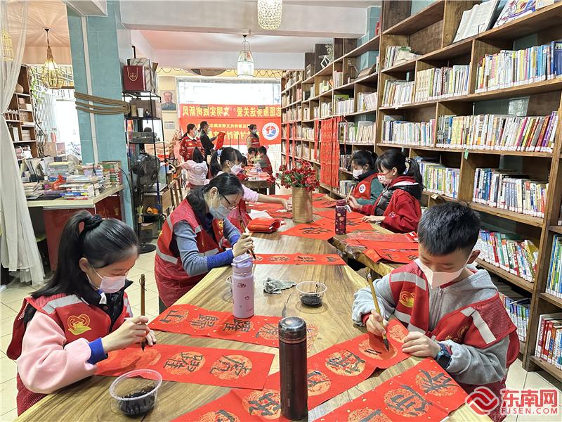 優(yōu)秀學(xué)生代表們揮毫潑墨寫春聯(lián)(李林村新時代文明實踐站供圖)