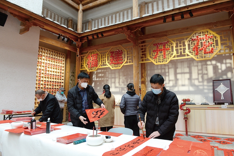 書法愛好者現(xiàn)場為群眾寫春聯(lián)送春聯(lián)