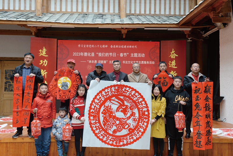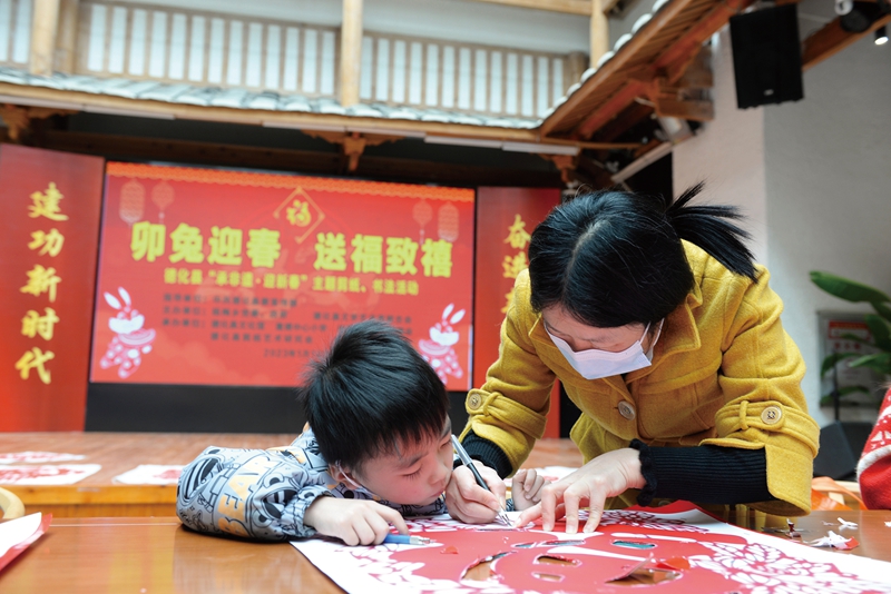 活動中,楊梅鄉(xiāng)云溪村民間藝人、德化縣剪紙協(xié)會會員運(yùn)用泉州市非物質(zhì)文化遺產(chǎn)——云溪刻紙技藝,在精心準(zhǔn)備好的各種“?!弊执盎▓D樣上精細(xì)鐫刻,通過疊、畫、剪、刻、粘等一系列技法下來,一副副精美窗花逐漸成型,有“?!弊譄艋\、“春”字鞭炮、“兔”形福娃……畫面精美,內(nèi)容豐富,寓意祥和,展現(xiàn)出瓷都德化人民激情高昂、積極向上的精神面貌,表達(dá)了對嶄新一年的美好愿景、幸福生活的殷殷期盼,也體現(xiàn)了云溪刻紙技藝融入傳統(tǒng)節(jié)日與日常生活的創(chuàng)造性轉(zhuǎn)化和創(chuàng)新性應(yīng)用。(瓷都德化 吳有森 林榮臻)