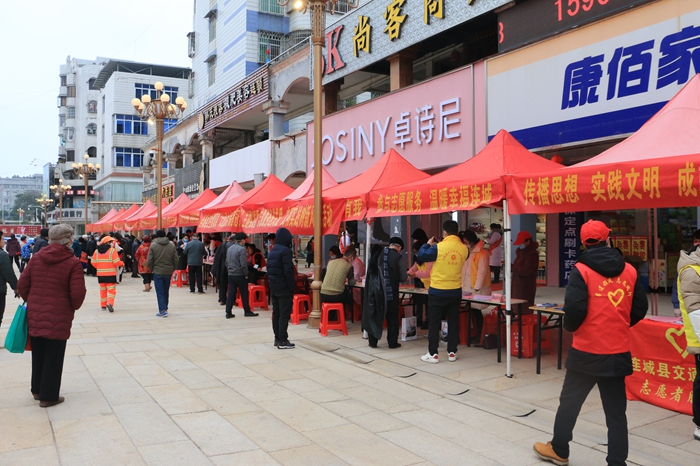 隨后,全縣50多支新時代文明實踐志愿服務(wù)隊開展“平安迎?!薄敖】涤!薄昂材!薄皭坌挠!钡认盗兄黝}志愿服務(wù)活動,向過往群眾提供維權(quán)咨詢、禁毒禁賭、反電信詐騙、移風(fēng)易俗、創(chuàng)城知識、急救知識、義診義剪、義務(wù)寫春聯(lián)等志愿服務(wù)活動,深受廣大群眾好評。