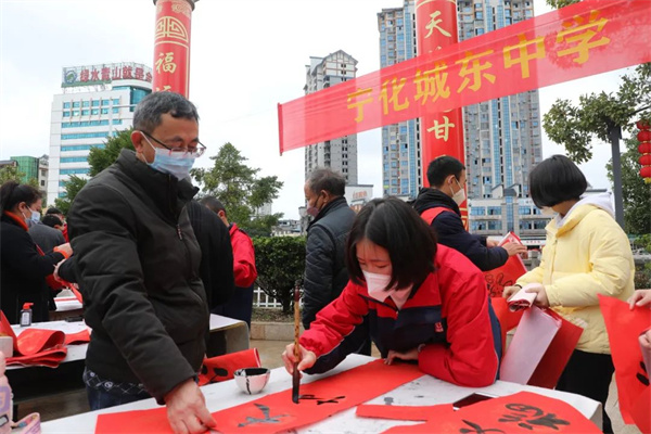 春節(jié)臨近,寧化縣城區(qū)春聯(lián)批發(fā)店里,前來購買“?!弊?、春聯(lián)等過年裝飾品的群眾絡(luò)繹不絕。近日,寧化縣校外活動中心及14所城區(qū)中小學(xué)的200余名師生志愿者兵分8路,在社區(qū)、廣場、超市門前等地,為廣大群眾寫春聯(lián),送上新春祝福。