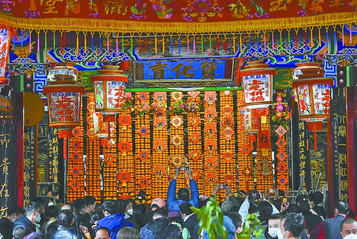 1月24日,農(nóng)歷正月初三,莆田市荔城區(qū)黃石鎮(zhèn)江東村的村民們一大早就全員出動,準備開春第一件“大事”——壘桔塔。村民們在浦口宮主殿梅妃像前壘起15座數(shù)米高的桔塔,祈愿吉祥平安、紅紅火火。