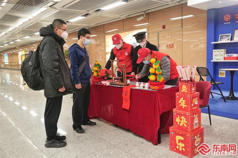 集美地鐵平安志愿者服務(wù)隊志愿者則在廈門北站5號口愛心驛站開展妙筆送“福”活動,將書畫、春聯(lián)和象征著幸福、吉祥的“福”送到乘客手中,用筆墨承載祝福,用愛心傳遞溫度,將祝福與文化送進千家萬戶。