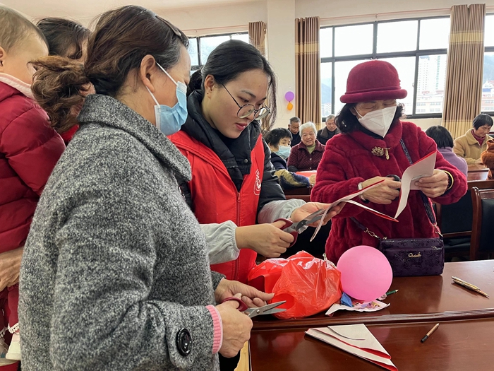 志愿者組織老人們進(jìn)行剪窗花活動(dòng)