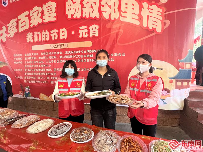 這是“共享百家宴,暢敘鄰里情——我們的節(jié)日·元宵”主題活動現(xiàn)場。當天下午四點,本次活動的重頭戲——百家宴正式開席。除了有姜母鴨、海蠣炸、同安封肉等閩南特色小吃,小酥肉、粉蒸肉、客家芋子包等各地知名美食也輪番登場,居民們在品嘗美食之余,還挽起袖子揉面團、搓湯圓,歡聚一堂吃湯圓、慶團圓。