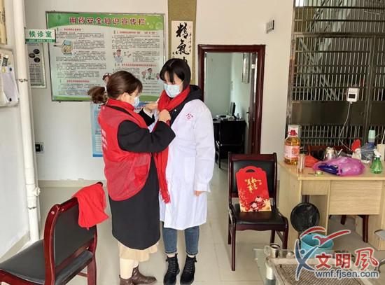 志愿者為醫(yī)務(wù)工作者圍上紅圍巾(翔安區(qū)新時(shí)代文明實(shí)踐中心供圖)