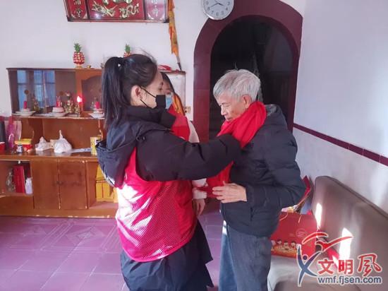 志愿者為老人圍上紅圍巾(翔安區(qū)新時(shí)代文明實(shí)踐中心供圖)