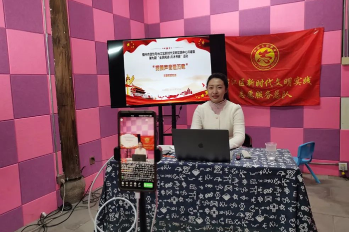 臺江區(qū)新時代文明實踐中心舉辦“黨的聲音進(jìn)萬家”主題新時代文明實踐活動,以抖音直播的方式和通俗易懂的語言,講清楚、講透徹黨的二十大精神內(nèi)涵,讓居民群眾聽得懂、學(xué)得會、記得牢,推進(jìn)黨的二十大精神學(xué)習(xí)入腦入心。