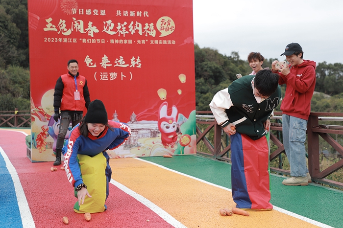 玉兔鬧春,迎祥納福。為豐富群眾節(jié)日精神文化生活,擴(kuò)大“福”文化影響力,涵江區(qū)“我們的節(jié)日?精神的家園?元宵——玉兔鬧春 迎祥納?!痹螆@活動(dòng)在涵江區(qū)萩蘆鎮(zhèn)崇福村順利舉辦。游園會(huì)結(jié)合新春兔年、“?!蔽幕戎黝},以“前兔似錦”“投財(cái)納?!薄柏?cái)源滾滾”“吉兔送?!薄巴脕磉\(yùn)轉(zhuǎn)”為名,分別設(shè)置了射箭、投壺、滾鐵環(huán)、拼福字、運(yùn)蘿卜五個(gè)趣味特色關(guān)卡,寓意集五福添福氣。同時(shí),融入做福燈、猜燈謎、搓湯圓等傳統(tǒng)民俗活動(dòng),集趣味性、知識(shí)性、娛樂性于一體,吸引群眾紛紛加入。此次游園活動(dòng)弘揚(yáng)和傳承了中國傳統(tǒng)民俗文化,豐富了人民群眾的節(jié)日生活,搭建了一個(gè)抒發(fā)節(jié)日情懷、傳遞美好祝愿的平臺(tái),促進(jìn)了崇福村與福文化產(chǎn)業(yè)的融合發(fā)展。