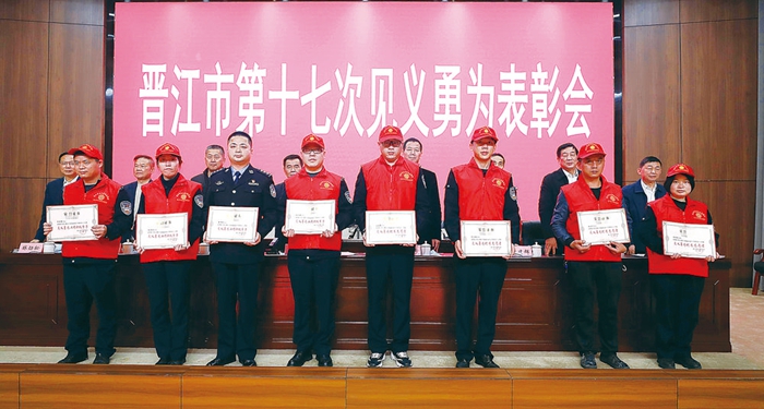 2月27日下午,晉江市召開第十七次見義勇為表彰會。會上,晉江市政府授予蘭靖翔“晉江市見義勇為模范”榮譽,給予張旭等9位同志通報嘉獎。同時,晉江市見義勇為人員獎勵和保護工作委員會通報表揚了一批見義勇為先進工作站、先進工作室、見義勇為工作積極分子和見義勇為優(yōu)秀志愿者,并為“晉江市瑞桐藍天見義勇為志愿者服務(wù)隊”授旗,進一步弘揚見義勇為精神,更好地傳播社會正能量。