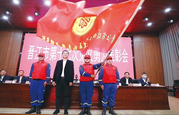 為“晉江市瑞桐藍天見義勇為志愿者服務(wù)隊”授旗