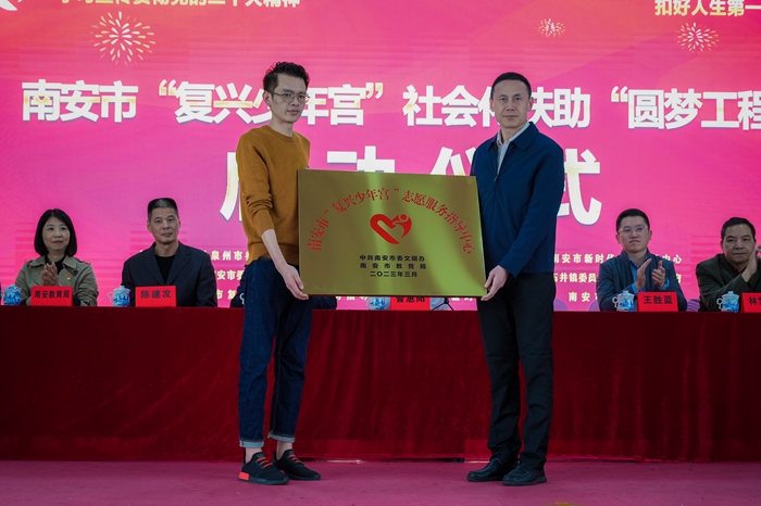 陳斌主任(右)為“南安市復(fù)興少年宮志愿服務(wù)指導(dǎo)中心”授牌