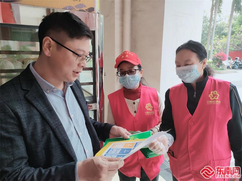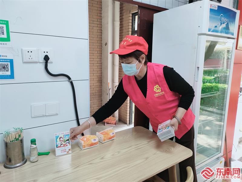 康城社區(qū)志愿者發(fā)放文明用餐牌。(王燕嵐 攝)