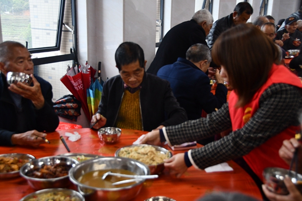 上午10點30分,老人們陸陸續(xù)續(xù)來到食堂,食堂的工作人員和志愿者們熱情招呼著前來用餐的老人們。米飯隨吃隨添,菜品葷素搭配,營養(yǎng)豐富,老人們吃得津津有味。