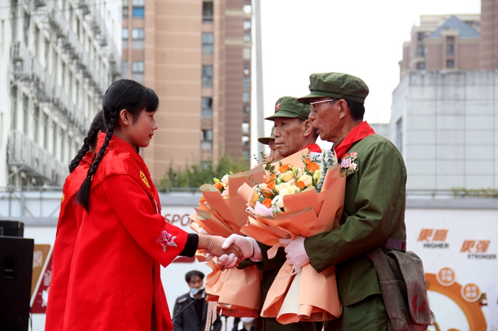 崇文小學(xué)少先隊(duì)員代表為退伍老兵代表獻(xiàn)花。 陳燕平攝