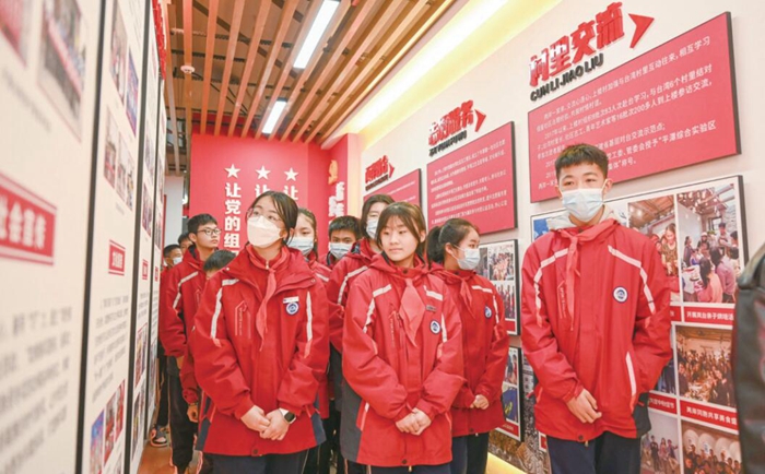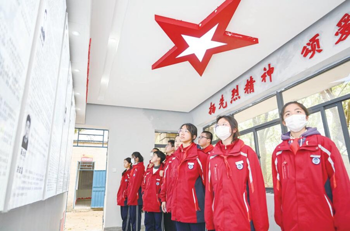 在英烈事跡展覽廳,學生們認真學習革命先輩的英雄故事。