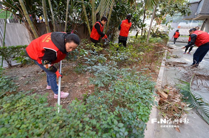 黨員志愿者們清理綠化帶垃圾(福州日?qǐng)?bào)記者 池遠(yuǎn) 攝)