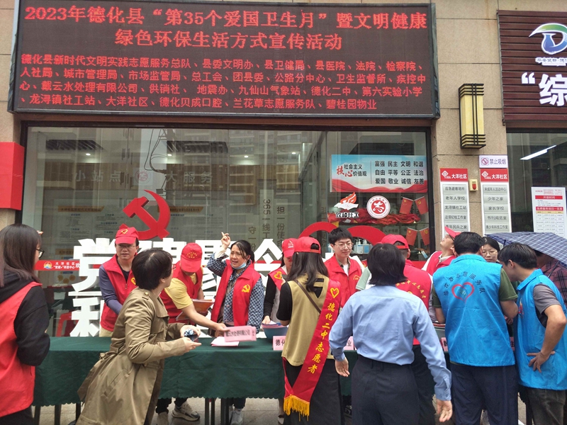 今年4月是第35個愛國衛(wèi)生月,為進(jìn)一步推動愛國衛(wèi)生運(yùn)動深入開展,引導(dǎo)群眾養(yǎng)成并踐行文明健康綠色環(huán)保生活方式,德化縣新時代文明實踐志愿服務(wù)總隊、縣委文明辦、縣衛(wèi)健局、縣城管局、縣市場監(jiān)管局等單位聯(lián)合舉辦“第35個愛國衛(wèi)生月”暨文明健康綠色環(huán)保生活方式宣傳活動,助力文明健康綠色環(huán)保理念深入人心。