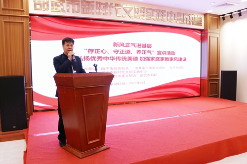 文明風4月28日訊(通訊員 吳利武 圖/文)為深入學習貫徹習近平總書記關于注重家庭家教家風建設的重要論述,弘揚優(yōu)秀中華傳統(tǒng)美德,建設好家庭、涵養(yǎng)好家教、傳承好家風。4月26日,由南平市政協(xié)機關、市委文明辦、市婦聯(lián)共同主辦的新風正氣進基層“存正心、守正道、養(yǎng)正氣”暨“弘揚優(yōu)秀中華傳統(tǒng)美德 加強家庭家教家風建設”巡講活動在邵武市新時代文明實踐大講堂拉開序幕?;顒佑赡掀绞形麄鞑坎縿諘蓡T、市委文明辦主任黃益水主持。
