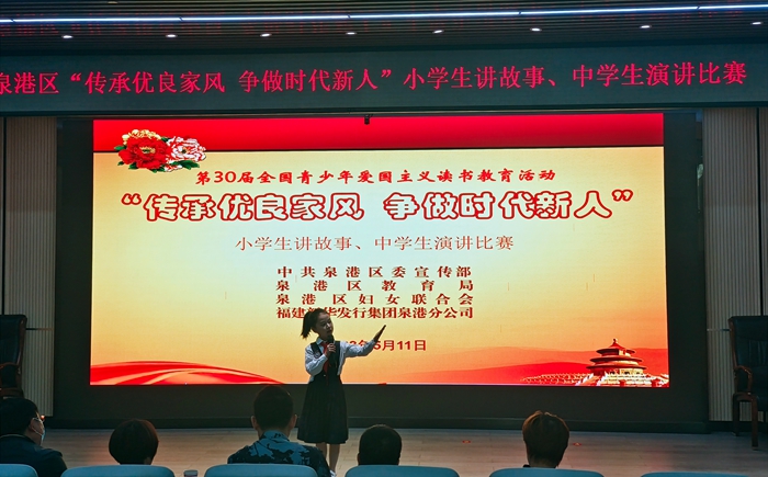 文明風(fēng)5月12日訊 為深入學(xué)習(xí)宣傳貫徹黨的二十大精神,深入貫徹習(xí)近平總書記關(guān)于注重家庭家教家風(fēng)的重要論述,培育和踐行社會主義核心價(jià)值觀,5月11日,泉港區(qū)舉辦“傳承優(yōu)良家風(fēng) 爭做時(shí)代新人”青少年愛國主義讀書教育活動。經(jīng)過學(xué)校選拔,共有32位優(yōu)秀中小學(xué)生參加全區(qū)現(xiàn)場演講、講故事比賽。