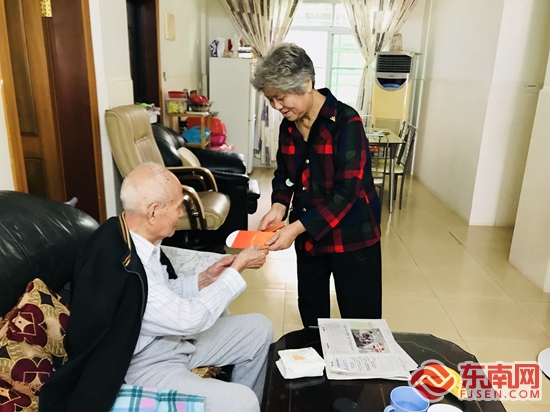 銀齡志愿者(右)上門為老人送慰問紅包。金山社區(qū) 供圖