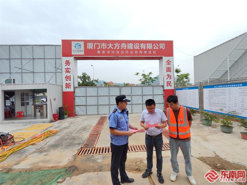 集美區(qū)城市管理局北站中隊(duì)隊(duì)員對(duì)轄區(qū)在建工地施工單位進(jìn)行文明施工宣傳,嚴(yán)控施工噪音,為考生營(yíng)造良好的考試環(huán)境(林德杰攝)