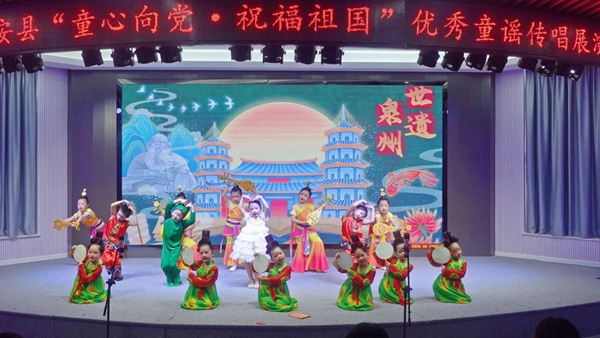 活動中,孩子們通過多樣的形式、新穎的構思傳遞童謠的魅力,唱響童心向黨、歌頌祖國、熱愛家鄉(xiāng)的主旋律?!蹲鎳鎳覑勰恪贰饵h是咱的好靠山》等一首首朗朗上口、旋律動聽的原創(chuàng)童謠滿載孩子們的愛國主義情懷,表達了對黨濃厚的熱愛之情;《惠安愈來變愈昳》《惠安韻·家國情》極富惠安本土特色,贏得了現(xiàn)場陣陣掌聲;《婀娜咱的惠安女》充分展示了新時代惠女精神,贊美了惠安女勤勞智慧和創(chuàng)新進取;《古樂南音》被孩子們用豐富的表現(xiàn)形式精彩演繹,美輪美奐、童趣十足。