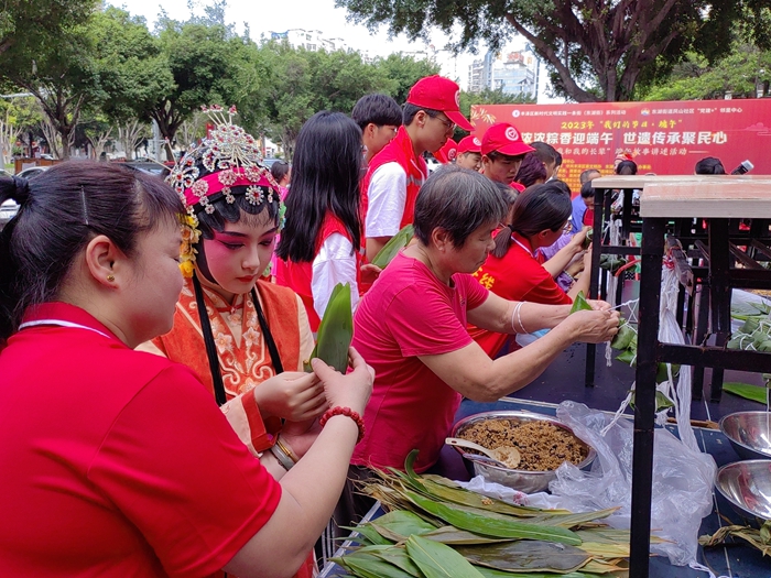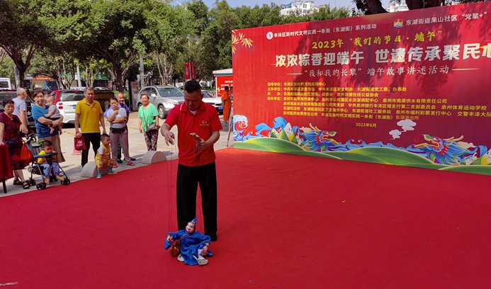在活動(dòng)現(xiàn)場,豐澤區(qū)新時(shí)代文明實(shí)踐一條街(東湖街)成員單位的志愿者們?cè)诂F(xiàn)場提供反詐、綜治、普法、掃黃打非、消防安全等宣傳咨詢。來自鳳山社區(qū)的二三十名老人,現(xiàn)場比賽包粽子,翠綠的粽葉裹上白色糯米,加進(jìn)各種五花肉、雞蛋等佐料,剛成型已經(jīng)是香飄四溢?!耙酝宋绻?jié),一般都是開展包粽子活動(dòng),這次有高甲戲、提線木偶戲表演,看這么精彩的演出,很特別也很有意義!” 居民胡先生說,家門口能看到往日舞臺(tái)上的演出,實(shí)在過癮,這才是弘揚(yáng)中華民族優(yōu)秀傳統(tǒng)文化、非遺文化的“正確打開方式”。