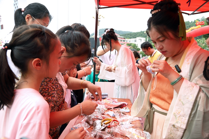 開幕式上,舞蹈歌曲精彩紛呈,更有沉浸式情景演繹,跨越時空與“屈子”互動對話?;顒蝇F(xiàn)場還設有投壺、制作祈福香囊、射五毒、包粽子比賽等互動體驗專區(qū),讓市民近距離體驗感受傳統(tǒng)文化的魅力。不少游客還身著漢服,佩戴五彩繩,穿行在體驗互動的各個展區(qū),打卡拍照、互動游玩,共同迎接端午佳節(jié)的到來。