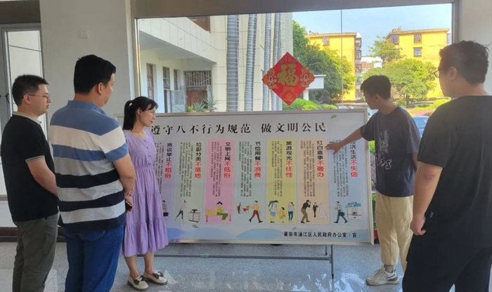志愿者分別對“八不”行為規(guī)范內(nèi)容進(jìn)行生動講解(涵江區(qū)政府辦、區(qū)財政局供圖)