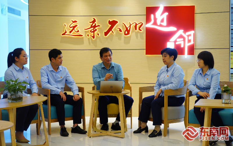 李華杰(右)與同事商討社區(qū)服務(wù)窗口辦理事項(xiàng)。受訪者 供圖