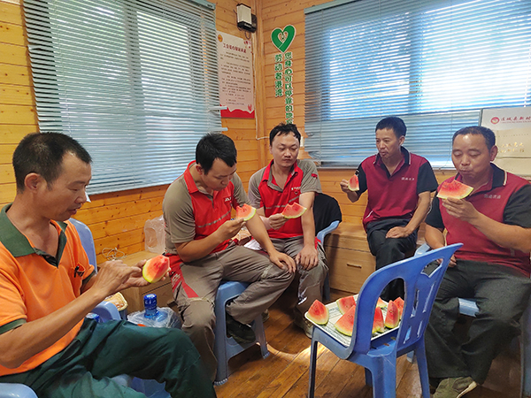 文明風7月13日訊 7月6日中午,走進連城縣西環(huán)路的“戶外工作者休息屋”,五個快遞員正在吃著冰西瓜消暑……