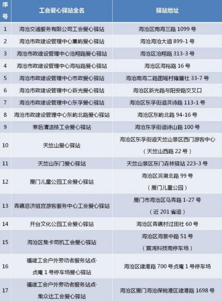 7月10日上午,位于廈門海滄建港路南側(cè)的貞庵1號停車場愛心驛站正式揭牌。該愛心驛站由海滄城建開發(fā)公司建設(shè)及日常管理,站內(nèi)配備有飲水機、微波爐、桌椅、空調(diào)、冰箱、電視、應急藥箱、維修工具箱、職工意見信箱、體溫測量儀器、雨傘、針線包、無線網(wǎng)絡(luò) (WiFi)等,且有單獨設(shè)立衛(wèi)生間,并配備了淋浴室。此外,海滄區(qū)總工會還為司機朋友準備了防暑降溫禮包。
