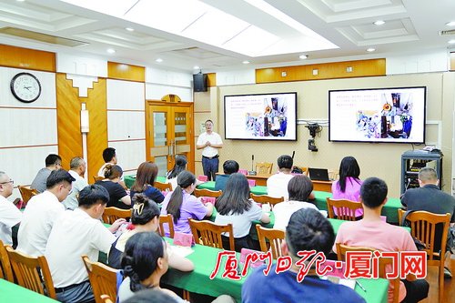 同安區(qū)第八期“文明一堂課”現(xiàn)場(chǎng),廈門(mén)市物業(yè)行業(yè)專(zhuān)家李振雷講解住宅小區(qū)的文明創(chuàng)建要點(diǎn)。(陳嘉新 攝)