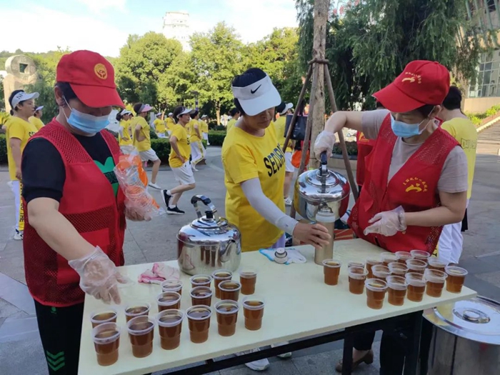 “市民廣場(chǎng)這個(gè)涼茶供應(yīng)點(diǎn)擺在這里很多年頭了,每一年入伏的時(shí)候,他們都擺在這個(gè)位置上,廣場(chǎng)早上非常多人鍛煉,鍛煉結(jié)束后,我們都會(huì)在這里喝上一杯才回家,非常感謝他們?!鼻皝?lái)喝茶的市民葉月平對(duì)此稱贊不已。