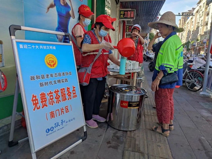 政和老年志愿者協(xié)會(huì)的志愿者們?cè)诮o市民倒涼茶。王詩(shī)琪 攝