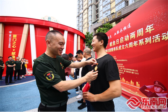 為確?;顒禹樌_展,主辦方還開展退役軍人無償獻血尊崇儀式,向獲得2020-2021年全國無償獻血奉獻獎的23名退役老兵頒發(fā)“最熱血軍人”紀念勛章,向參加此次獻血活動的老兵頒發(fā)“2023熱血軍人”紀念勛章。“一枚小勛章,體現(xiàn)大情懷。軍人崇尚榮譽,珍惜榮譽。我們首次推出獻血紀念勛章,是退役軍人參加無償獻血公益活動新舉措,也是對退役老兵參與無償獻血的尊崇和褒獎,希望能激勵和引導更多退役老兵加入進來,捐獻一份熱血,讓城市更有溫度。”廈門“一鷺先鋒”退役軍人志愿服務總隊無償獻血分隊負責人張寧義自豪地說。