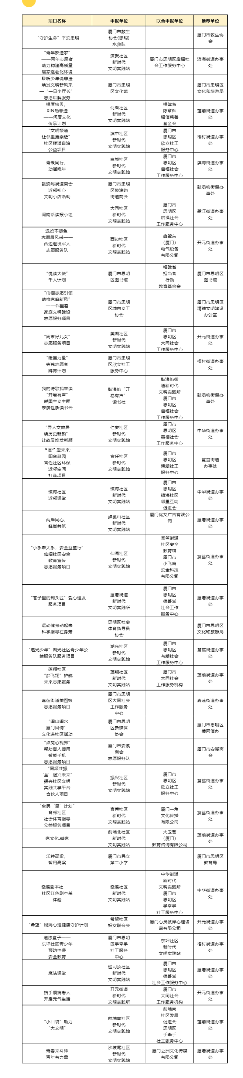 根據(jù)《關(guān)于舉辦2023年“創(chuàng)享文明·幸福思明”思明區(qū)新時(shí)代文明實(shí)踐項(xiàng)目首屆創(chuàng)投大賽的通知》要求,經(jīng)各街道新時(shí)代文明實(shí)踐所、主辦單位初審,專家評(píng)審團(tuán)復(fù)審評(píng)分,大賽組委會(huì)核定通過,現(xiàn)將入圍現(xiàn)場(chǎng)評(píng)審的37個(gè)文明實(shí)踐創(chuàng)投項(xiàng)目進(jìn)行公示。(思明區(qū)委文明辦)