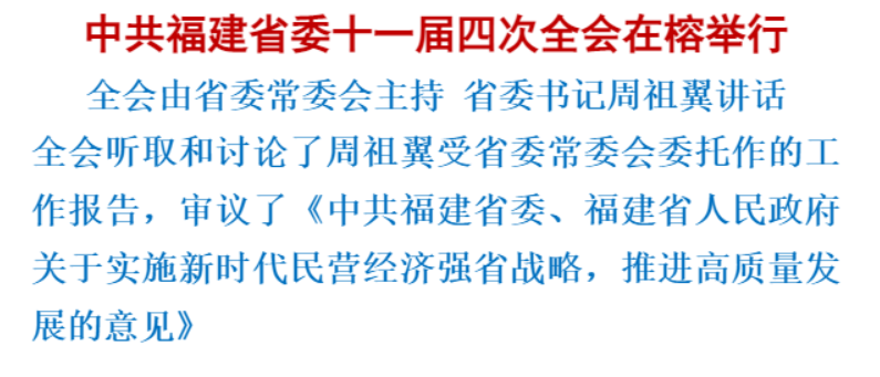 全會要求,全省各級黨組織和廣大黨員干部要深入學(xué)習(xí)貫徹習(xí)近平總書記關(guān)于民營經(jīng)濟發(fā)展的重要論述, 以高度的思想自覺、政治自覺、行動自覺,做好實施新時代民營經(jīng)濟強省戰(zhàn)略各項工作。要著力優(yōu)化營商環(huán)境、推動高質(zhì)量發(fā)展、營造重商親商愛商的濃厚氛圍,讓民營經(jīng)濟這片“森林”盡享“陽光雨露”、更加“本固枝榮”、扎根“肥沃土壤”,努力讓民營經(jīng)濟像綠水青山一樣成為福建的驕傲。要加強黨的全面領(lǐng)導(dǎo),建立健全促進民營經(jīng)濟發(fā)展壯大的統(tǒng)籌協(xié)調(diào)機制、思想政治建設(shè)機制、激勵約束機制、宣傳引導(dǎo)機制、總結(jié)評估機制。