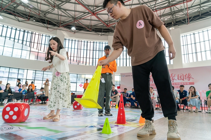 單身男女青年們參加暖場游戲、互認名字、同手同腳等互動游戲增進彼此之間的了解。