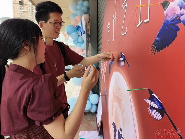 活動(dòng)現(xiàn)場,主辦方組織社工與20余名志愿者開展婚俗改革、優(yōu)良家風(fēng)建設(shè)宣傳,為現(xiàn)場新人拍攝甜蜜合影,活動(dòng)還設(shè)有穿針乞巧、情侶手作DIY等環(huán)節(jié)。在社工與志愿者的引導(dǎo)下,新婚夫妻紛紛“動(dòng)手”,密切配合,合作無間,不一會(huì),一個(gè)個(gè)精致的DIY作品誕生,留下最美好的回憶與紀(jì)念。