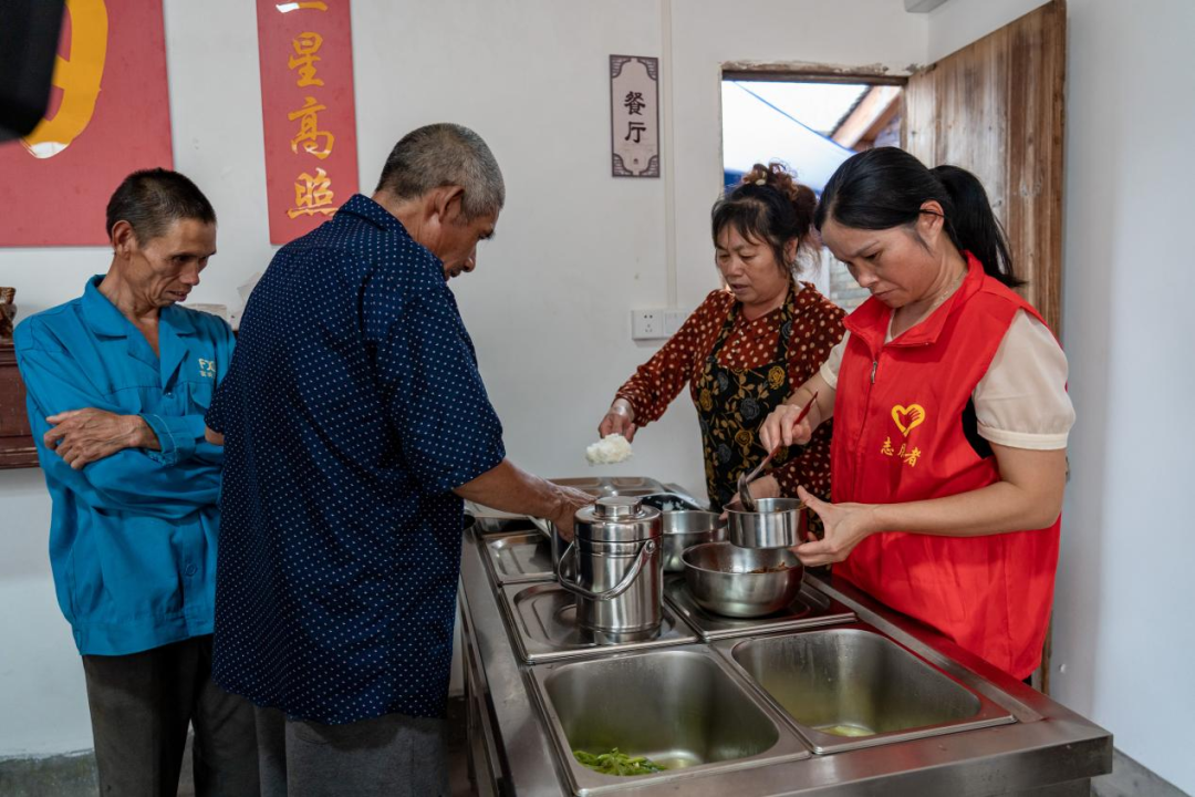 宣和鎮(zhèn)培田村老人食堂里志愿者正在為老人打飯菜。江云華 攝