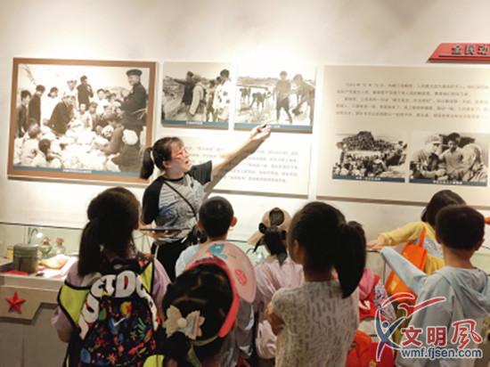 工作人員還帶領(lǐng)孩子們來到黃厝村開展藝術(shù)體驗之旅,通過現(xiàn)場參觀、觀看影片等形式,更深入地了解家鄉(xiāng)的文化特色。在講解老師的帶領(lǐng)下,孩子們在“英雄三島精神”主題館里認真地聆聽先輩們的故事,感悟革命精神,傳承紅色基因。