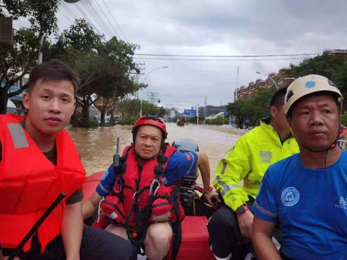 “當時后門水位較低,可以通行,社區(qū)衛(wèi)生服務中心的工作人員將藥品打包好暫放在后門,在社區(qū)工作人員的引導下,救援小組駕著沖鋒舟直接抵達后門轉運點?!备G迨猩磉吅萌恕⒏G迨兴{天救援隊隊員陳祖應告訴記者。