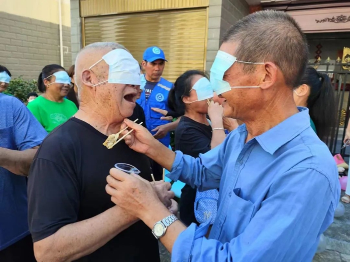 高唐鎮(zhèn)“益在中秋,樂在國(guó)慶”活動(dòng)中老人體驗(yàn)蒙眼吃月餅