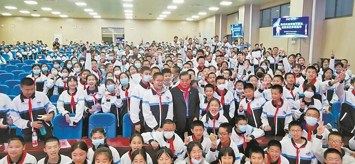 今年4月14日,剛完成《飛天圓夢》講座的黃春平,被格致中學鼓山校區(qū)的孩子們圍繞合影。(福州格致中學鼓山校區(qū)供圖)