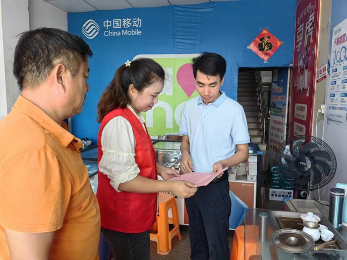 志愿者向沿街店鋪分發(fā)宣傳材料(泉港區(qū)委文明辦供圖)