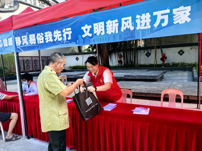 志愿者向群眾分發(fā)移風(fēng)易俗宣傳冊(cè)和袋子(倉(cāng)山區(qū)委文明辦 供圖)