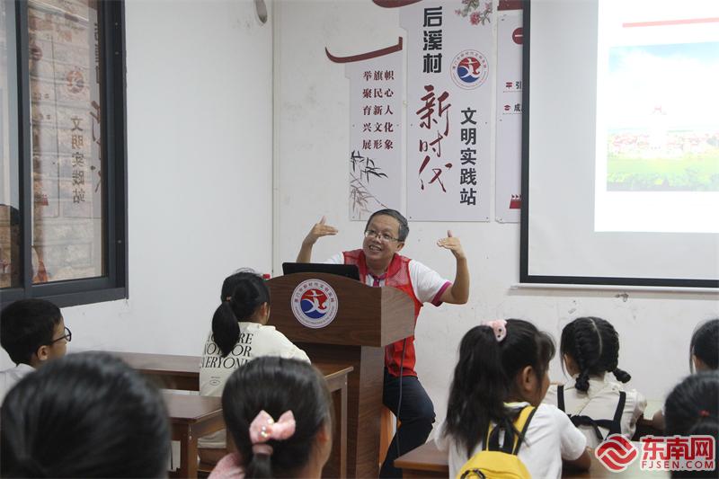 集美大學(xué)陳嘉庚與華人華僑資料中心主任廖永健為后溪村小朋友介紹嘉庚建筑。(東南網(wǎng)記者 李霖 攝)